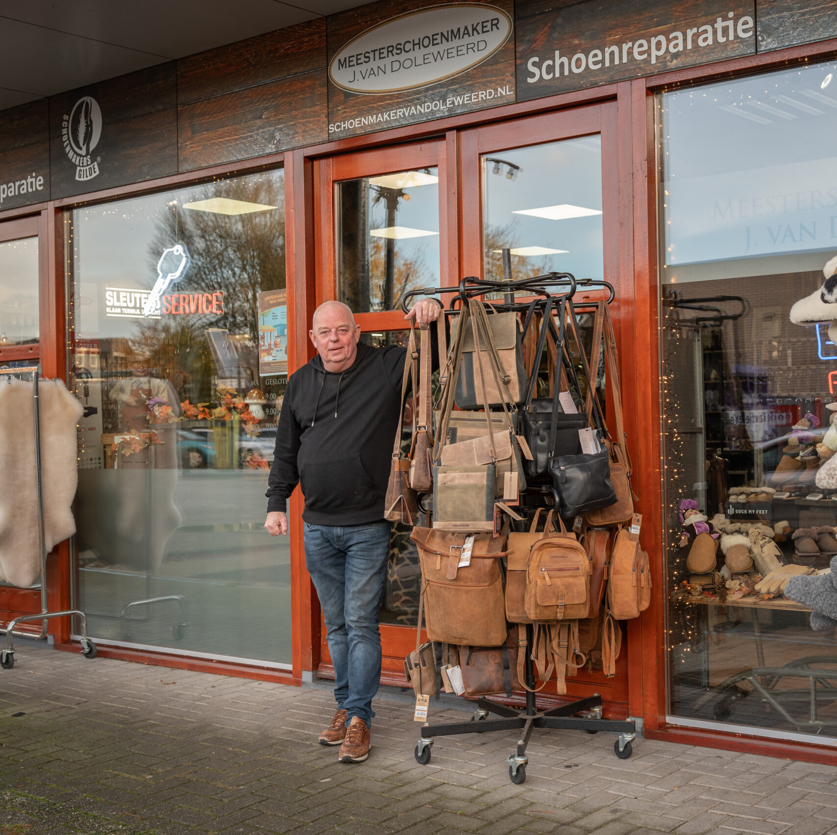 Gecertificeerd schoenmaker en dé plek voor sleutelservice, naamborden en een grote collectie lederwaren.